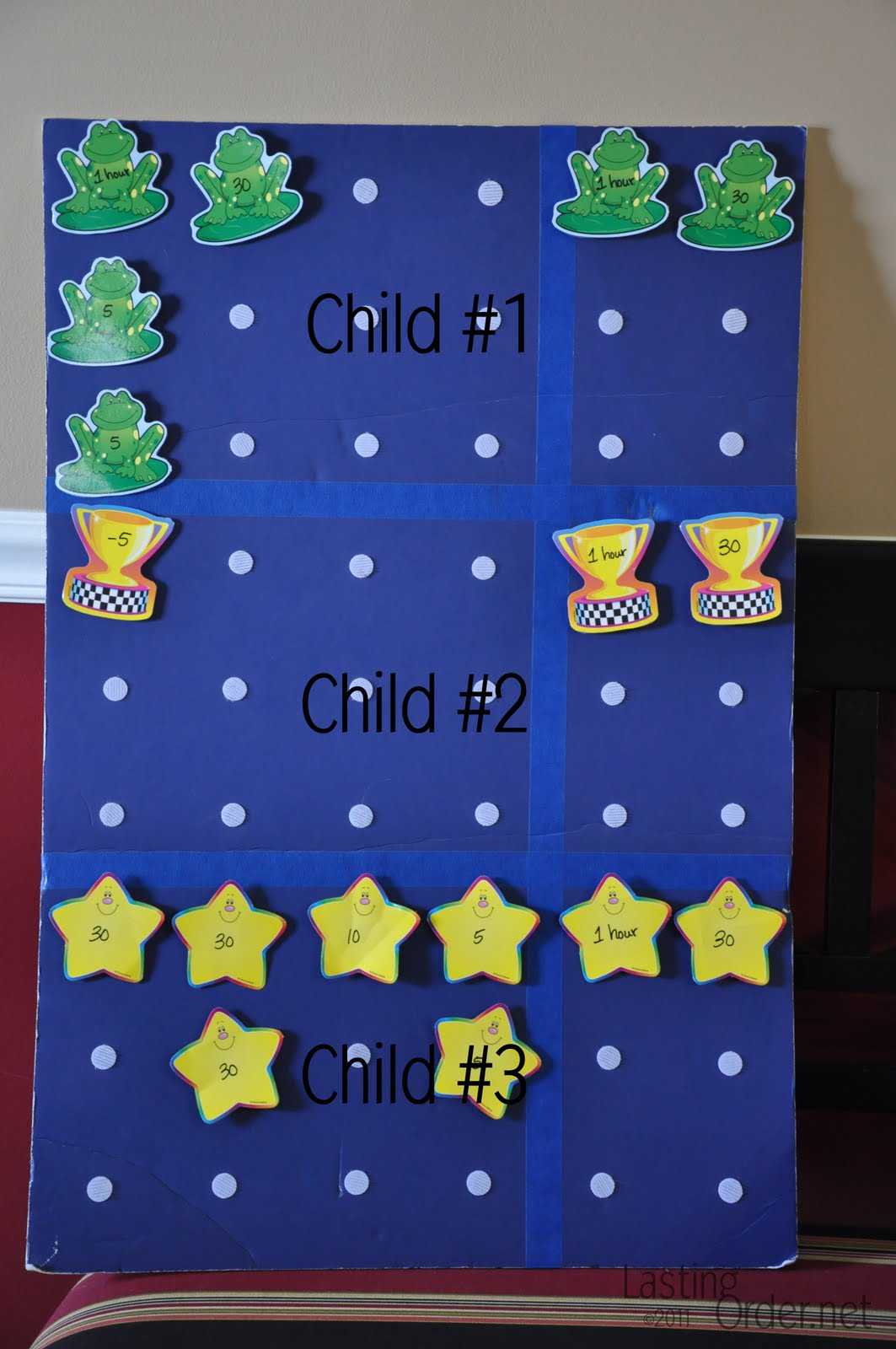 This system made it very easy for me to say "Take off 5 minutes for arguing." in a calm voice, rather than getting upset or yelling. We found that this system worked really well for our boys and our family. You could set up the times for whatever you think is appropriate for the ages of your child(ren). Our boys have outgrown the cute-sy shapes and we are constantly updating our methods of discipline and rewards as they grow older, but I wanted to share an idea with you that worked for us!